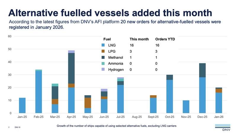 According to the latest figures from DNV’s Alternative Fuels Insight (AFI) platform, a total of 20 new orders for alternative-fueled vessels were placed in January 2026.