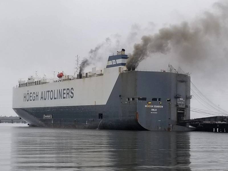 A fire broke out on board the 600-foot vehicle carrier Hoegh Xiamen, at Blount Island in Jacksonville, Fla. (U.S. Coast Guard photo by Jessica Maldonado Gonzalez)