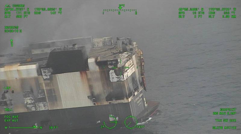 A salvage team has arrived at the scene of the burning car carrier Morning Midas, located approximately 220 miles south of Adak, Alaska.
